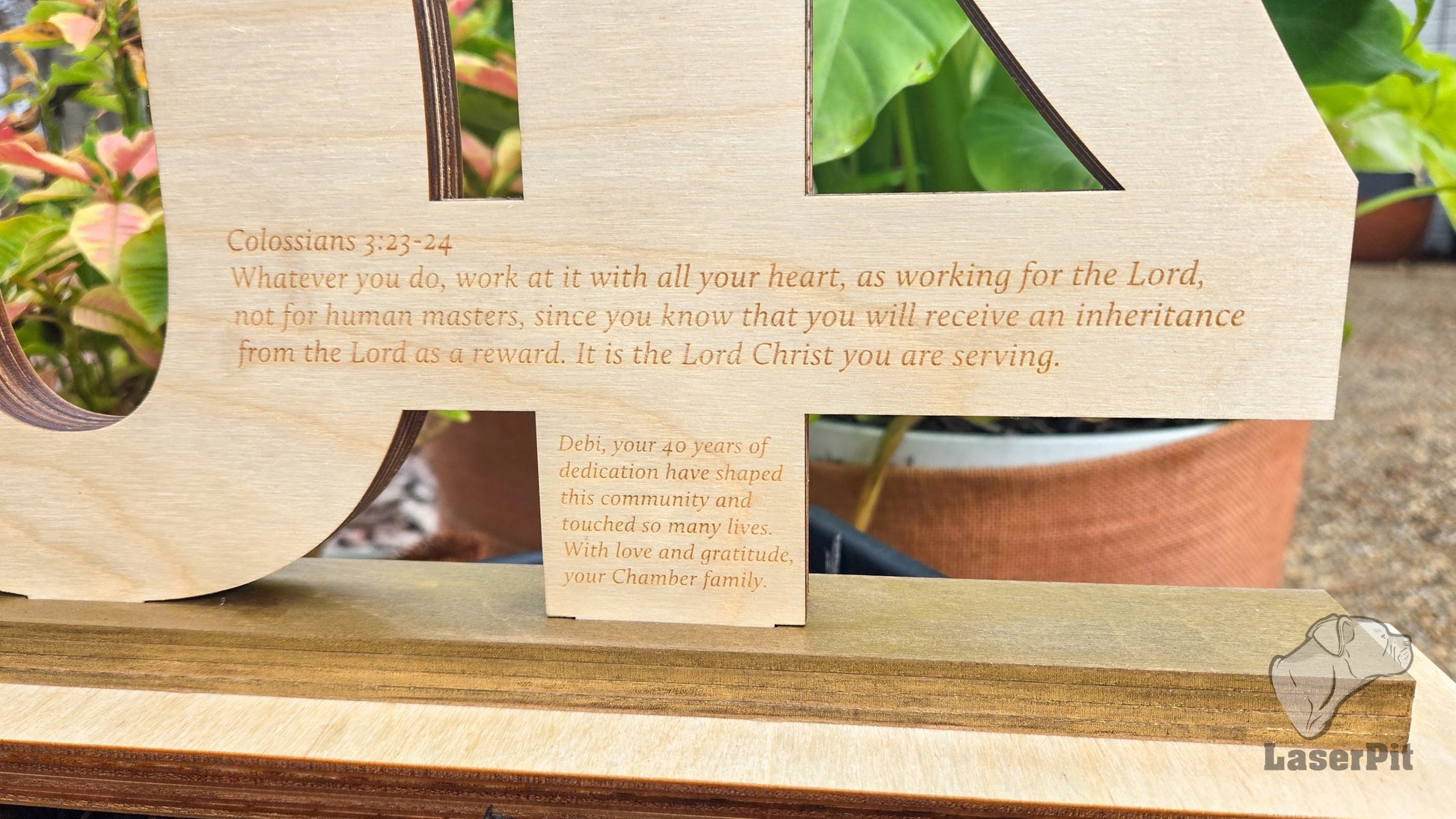 Celebrate a milestone with more than just a plain crystal block. This custom number-shaped award is built from cascading layers of wood, designed to represent years of dedication in a way that's both artistic and personal. Mounted on a sturdy base and featuring handwritten or typed notes from colleagues, friends, or family on the back, it’s a true conversation starter. More than an award—it’s a statement piece that actually deserves a spot on the shelf.